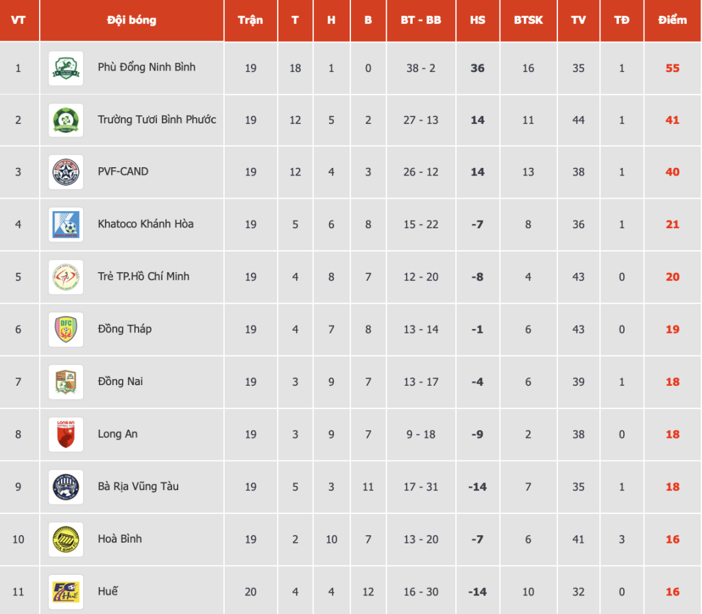 Hai đội Bình Phước và PVF-CAND tranh ngôi á quân, đồng nghĩa với suất play-off thăng hạng V.League 2025/26. Bình Phước tạm xếp thứ 2 với 41 điểm. PVF-CAND đứng thứ 3 với 40 điểm.