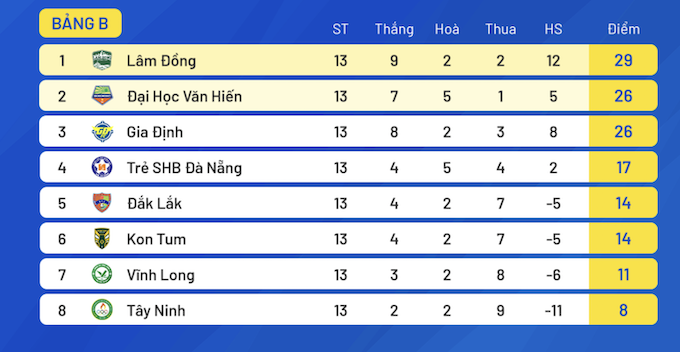 LỊCH THI ĐẤU VÒNG 14 CỦA BẢNG B (NGÀY 22/6)15h00 Tây Ninh vs Kon Tum15h00 Vĩnh Long vs Trẻ SHB Đà Nẵng15h00 Gia Định vs Lâm Đồng16h00 Văn Hiến vs Đắk Lắk